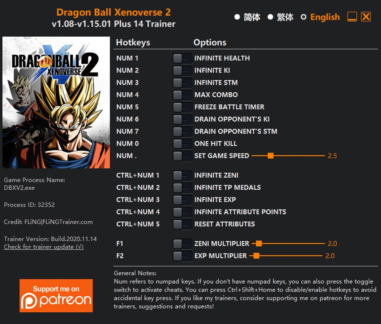1. "Infinite Zeni"는 Zeni를 얻거나 사용할 때 적용됩니다.2. “무한 TP 메달”은 TP 메달을 얻거나 사용할 때 적용됩니다.3. "무한 Exp"는 전투에서 승리 할 때 적용됩니다.4. “무한 속성 포인트”: 속성 메뉴에 들어가기 전에 활성화합니다. 모든 속성을 최대로 높이는 데 충분한 포인트를 제공합니다.5. “Reset Attributes”: 속성 메뉴에 들어가기 전에 활성화합니다. 모든 속성을 10으로 재설정합니다. 값을 저장하려면 하나 이상의 속성을 레벨 업해야합니다.6. "One Hit Kill": 활성화되면 비활성화하더라도 전체 전투에 영향을 미칩니다. 이 옵션을 비활성화하려면 전투를 완료해야 효과를 복원 할 수 있습니다.